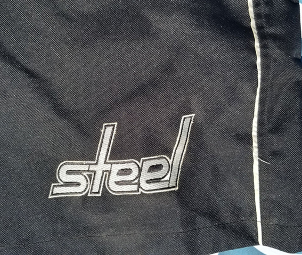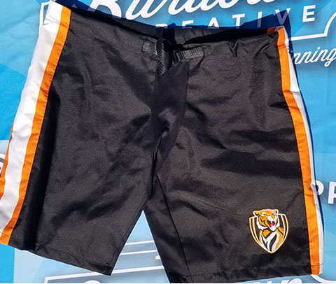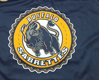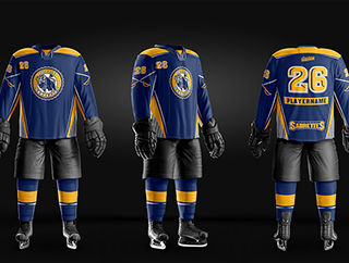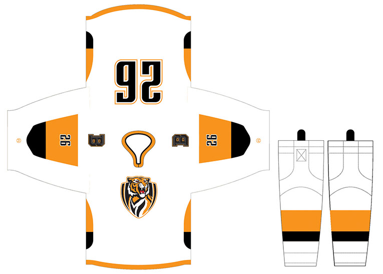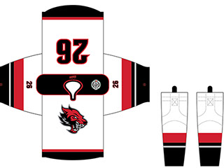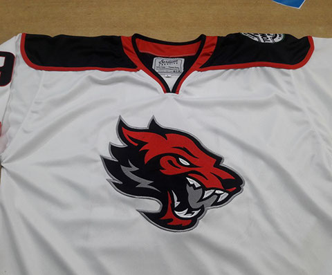 Cut and sew style jersey. Embroidered crest, embroidered shoulder patches and stitched numbers, pant shells with embroidery logo.