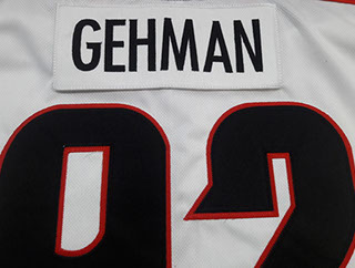 Cut and sew style jersey. Embroidered crest, embroidered nameplates, shoulder patch and stitched numbers.