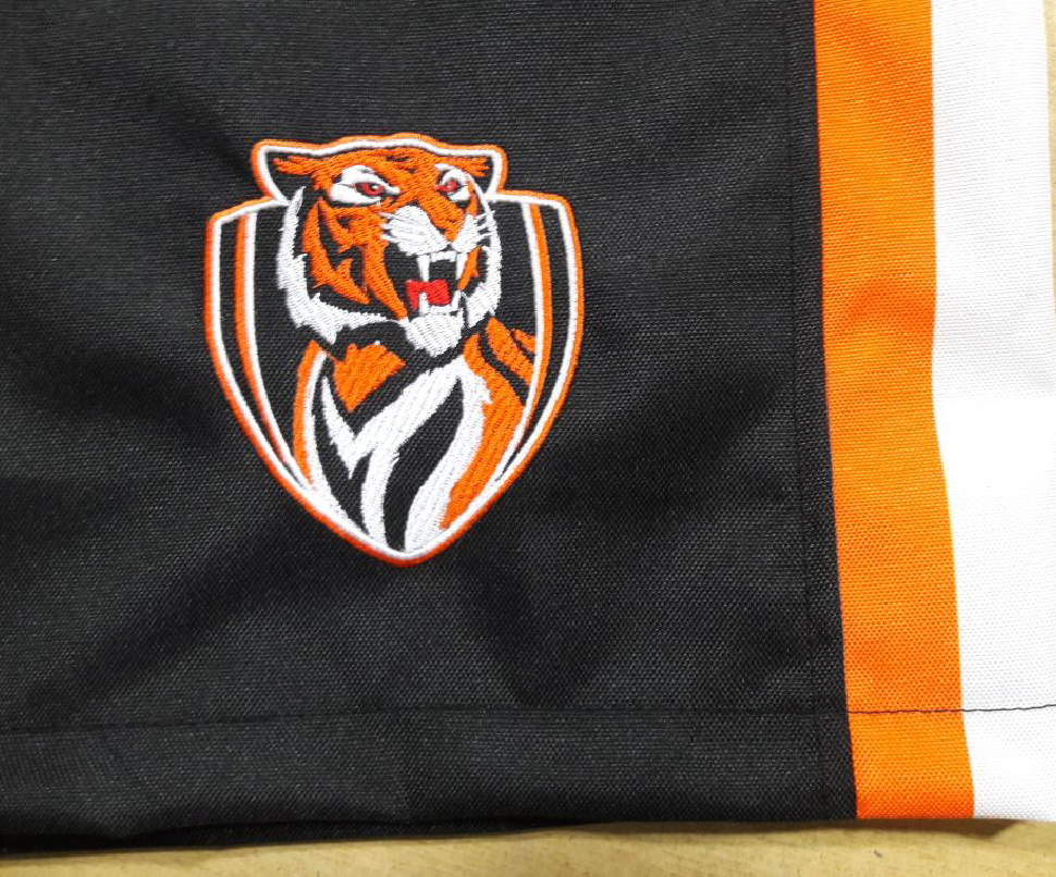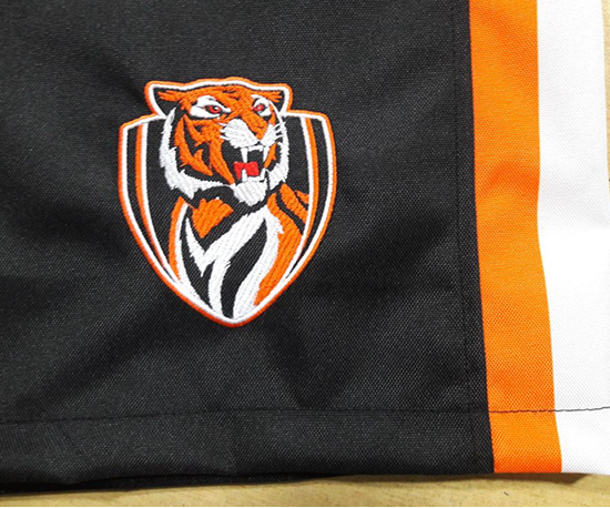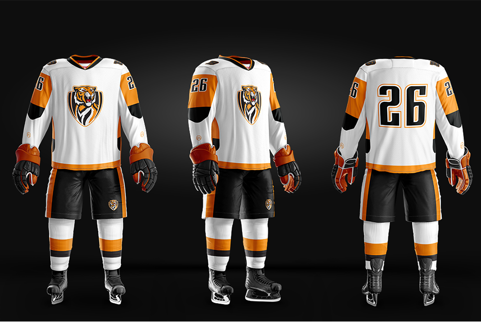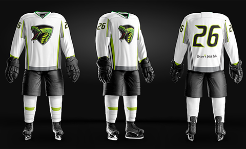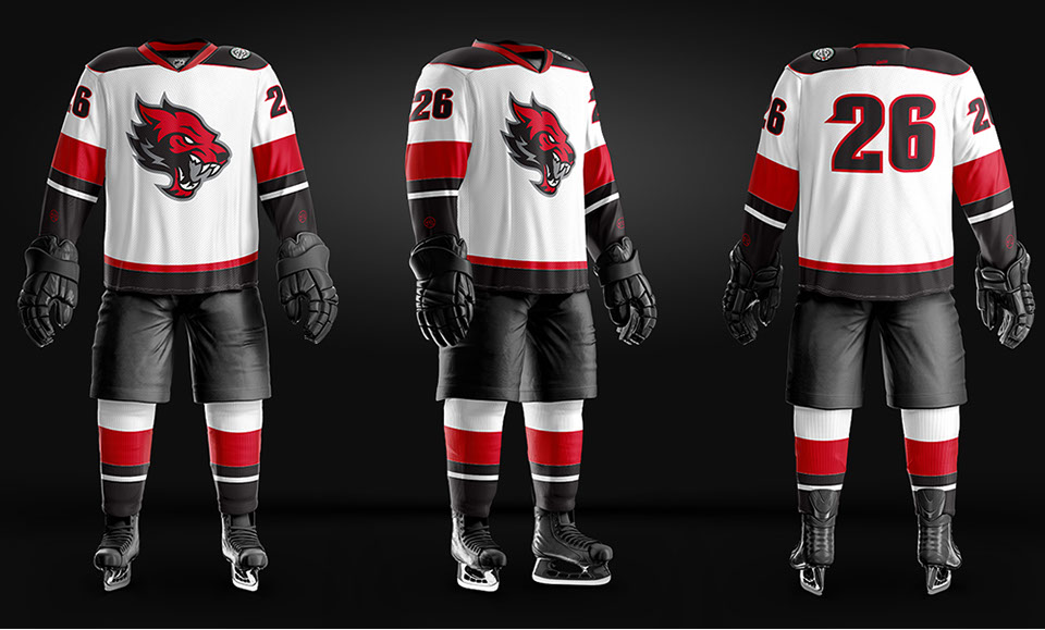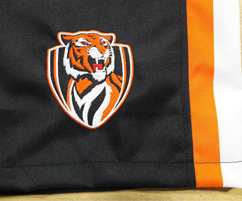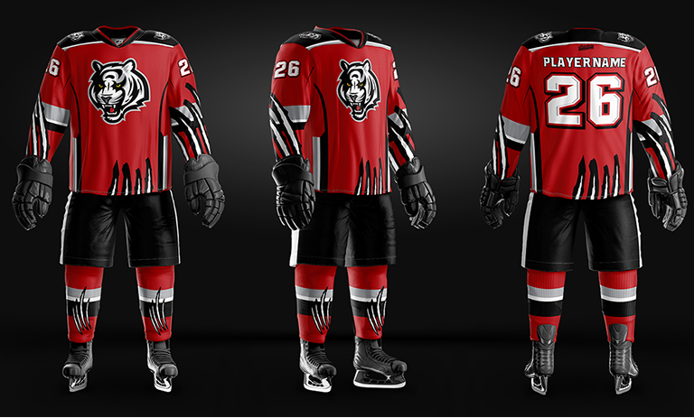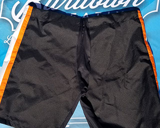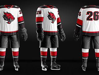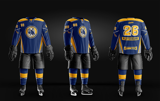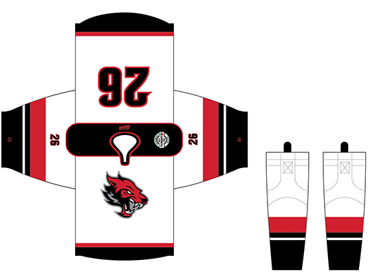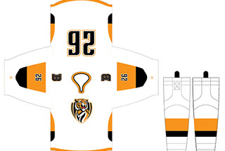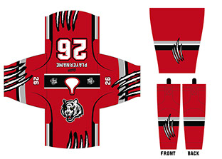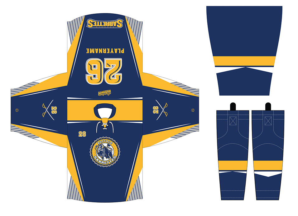 Cut and sew style jersey. Embroidered crest, embroidered shoulder patches and stitched numbers, pant shells with embroidery logo.
